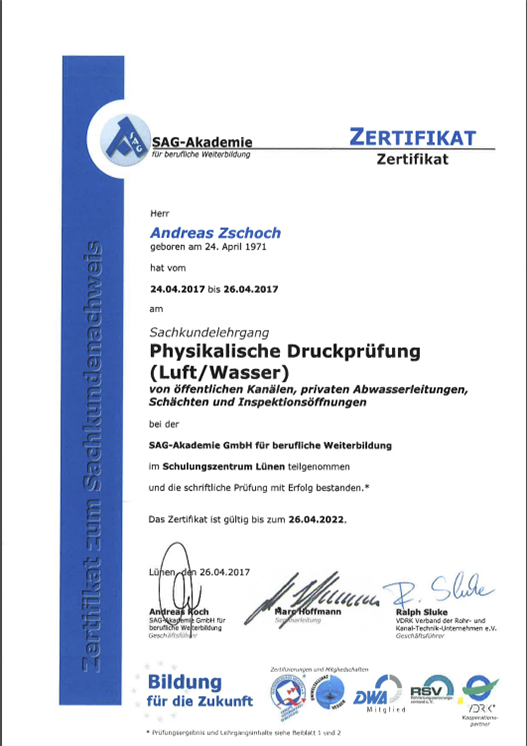 - Sachkundelehrgang: Physikalische Druckprüfung (Luft/Wasser) von öffentlichen Kanälen, privaten Abwasserleitungen, Schächten und Inspektionsöffnungen